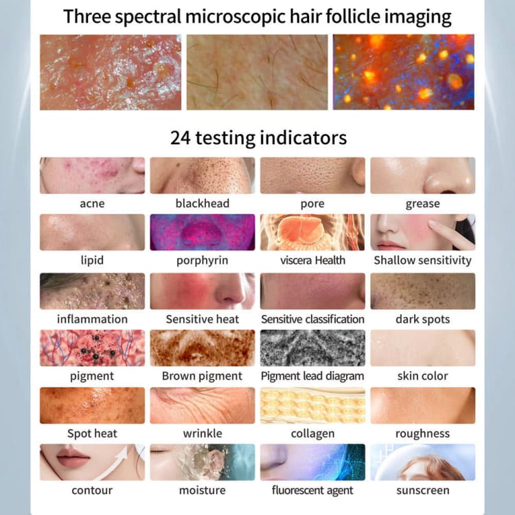 - Comprehensive Skin Condition Assessment: This professional skin analyzer accurately detects acne, sensitivity, pigmentation, and signs of aging. With targeted detection indicators, it helps skincare professionals quickly determine personalized treatment plans. Microbiome testing reveals skin abnormalities invisible to the naked eye at the microscopic level, enabling early prevention and care for long-term skin health.